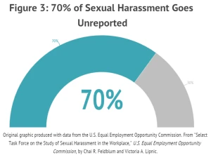 Due to the fear of retaliation and other consequences, the US Equal Employment Opportunity Commission states that approximately 70% of sexual harassment goes unreported (Figure 3). Sexual harassment in the workplace occurs more often than most corporate officers or average employees suspect. To create safer reporting for employees, the method(s) of reporting should be to an external watchdog agency that is independent from the company and will keep victims anonymous.[x] Encouraging the use of reporting methods that keep victims safe can help to properly address the behavior of harassers and create a more positive work environment for the victims.